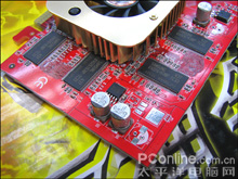 该卡由8粒三星GDDR 8M×16bit规格显存颗粒构成双128显存单元,显存已经升级为3.3ns。标准频率600MHz。