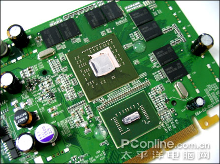 由于7600GS是基于原生PCI-E接口芯片组,因此必须借助这颗BR02 HSI桥接芯片完全其从PCI-E到AGP 8X的转换过程。