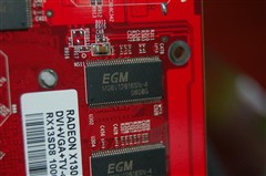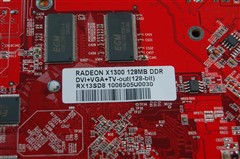 显存方面,磐正X1300采用了5ns GDDR显存颗粒,正反面共8颗,组成128MB/128bit显存规格,默认频率为450/400MHz。磐正这款X1300的默认工作频率较低,显卡在显存供电部分稍做了些改动,减去了显存供电电路中的一个电感线圈。显卡采用了6层红色PCB板,供电电路中选用了优质的电解电容,为显卡稳定工作奠定了良好基础。