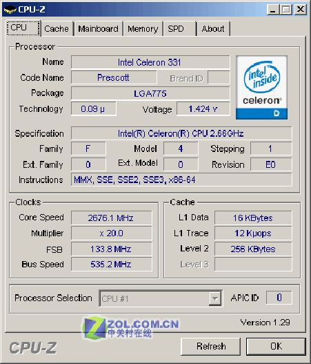 产品采用加装金属顶盖设计。产品采用0.09微米工艺,Prescott核心,LGA 775接口,主频为2.66GHz,256KB L2缓存,支持533MHz的FSB,具备以往赛扬D处理器所不具备的硬件病毒防火墙功能,而最重要的是支持64位扩展技术——EM64T。