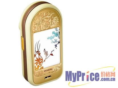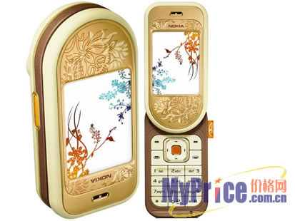 倾慕系列以奢华铸造时尚,深咖啡色调并没有沉闷气息,反而多了一份柔和、华贵。诺基亚7370应该说是倾慕系列中最为引人的一款,它采用皮革设计,独特旋转屏幕,暗色花卉图案,魅力奢华,88*43*23mm的机身尺寸,103克的重量,整体小巧宜人,手感不俗。