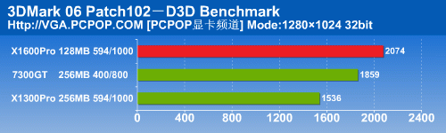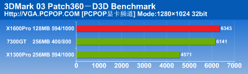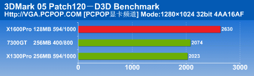 在3DMark05中,X1600Pro12个像素单元的实力得到了完全发挥,以非常大的幅度将另外两款显卡抛在了后面。