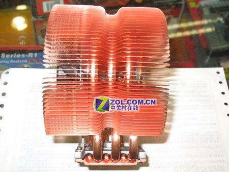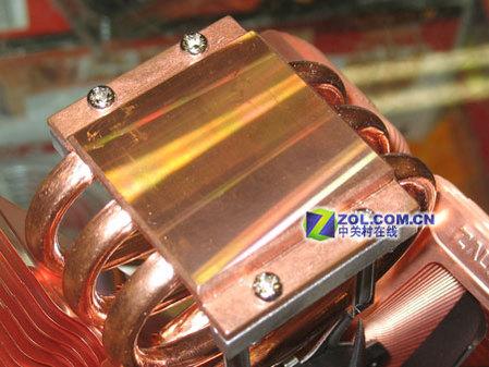CNPS9500AT采用纯铜结构:铜底座+铜热管+铜鳍片,“8”型的三根热管贯穿了纯铜的放射状鳍片。鳍片的分布类似经过压固工艺处理,均匀地以放射状排列。热管与底座结合紧密,能够迅速带走底座吸收的热量。不过纯铜并没有增加太多的重量,采用放射型的鳍片设计后,这款产品的重量只有530g。