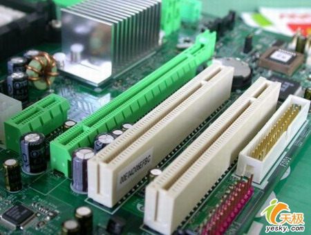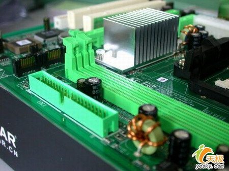 主板提供了两条内存插槽,支持双通道DDR800内存模式,最大支持2GB,对于一般用户来说,已经完全够用了。通过映泰开发的PCI-EX技术,额外提供了一条物理上的PCI-E X16显卡插槽,主板还提供1条PCI-E X1插槽以及2条PCI插槽。