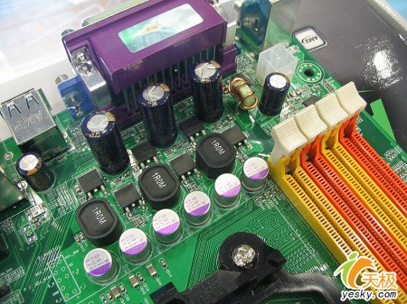 功能方面:主板集成了RTL8100c百兆网络芯片,ALC655 5.1声道的音频输出端子,充分满足普通家庭、网吧的简单需要。扩展槽提供了1条PCI-Express×16和2条传统PCI。由于没有提供额外的PCI-Express,从安全的角度考虑,图形卡扩展槽贴上特别注意的事项,标注其功能的专属。南桥MCP410提供了2组SATA2、2组PATA和10组USB2.0,拥有SATA RAID的功能。内存插槽4条DIMMs双色搭配,DDR2 800MHz工作频率上限,数量上达到C51G的高配,容量最高8GB空间。