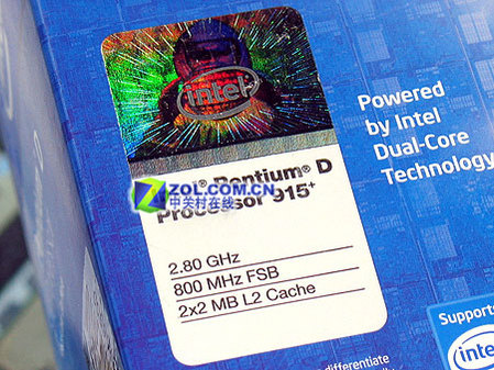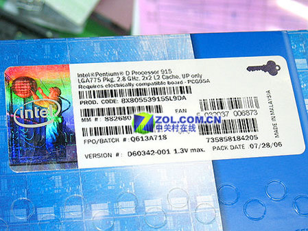 产品规格标签上标注了产品为Pentium D Processor 915+,核心频率为2.8GHZ,同奔腾D820一样,800MHZ前端总线,二级缓存为2X2MB。