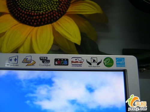 屏幕的右上角,标注了190CW7所拥有的特性,从左至右依次为:宽屏、5ms响应时间、DVI+D-Sub双接口、sRGB色温模式、Built-in内置电源、防火材料、绿色环保认证以及能源之星低功耗标志,看过这些我们基本上可以知道190CW7所有的一些性能,一目了然。