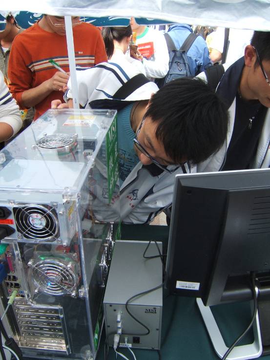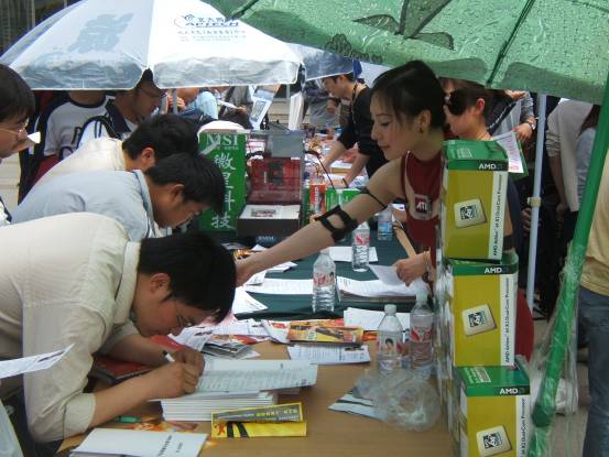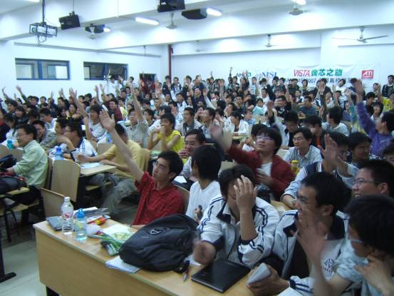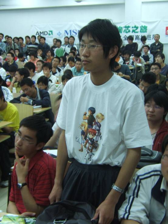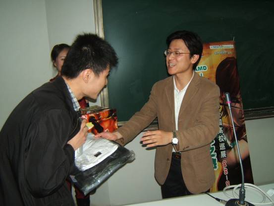风景如画的校园从标语中不难看出学校培养实干型人才的决心走过路过别错过,“AMD-MSI VISTA绚芯之旅”校场内的活动宣传点人气火暴透明机箱真不错,仔细看看!同学们在认真填写调查问卷MM也来填写调查问卷有1/8欧洲血统的南京邮电大学RUBY这可是真功夫!培训会刚刚开始,已经全场爆满没办法,人太多了,挤在门口听哇,好多奖品啊!AMD华东区市场专员纪有为先生为同学颁发大奖AMD 视觉多媒体销售经理 帅海江先生也被现场同学的热情打动了帅海江先生亲自走到同学当中提问怎么报答同学的热情呢,微星上海总公司市场经理蒋红刚先生拿出大奖主板介绍中宇瞻科技华东区市场专员展凯先生也送出了1GB内存条 同学纷纷举手抢答问题