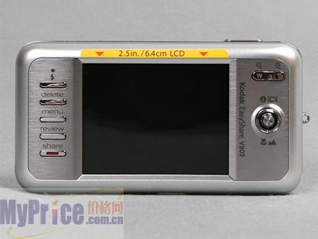 柯达V803背后采用一块2.5英寸LCD,其显示精度为15万像素。其快门速度为8-1/1448秒,具有手动可选的多种对焦和测光模式,同时还支持5种白平衡以及5种色彩模式。支持640×480/30fps的视频拍摄,另外还支持3:2格式的静态影像拍摄。