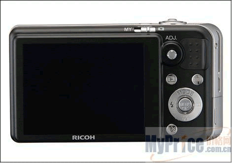 R7机身背面配备了一块2.7英寸的透明非晶质硅TFT LCD,像素约23万,显示效果还是非常不错的,而且用户还可以跟据光线的强弱对屏幕进行亮度的调整。屏幕的右侧是按键区,由上至下分别是理光特有的ADJ.快捷键,回放键和DISP键。