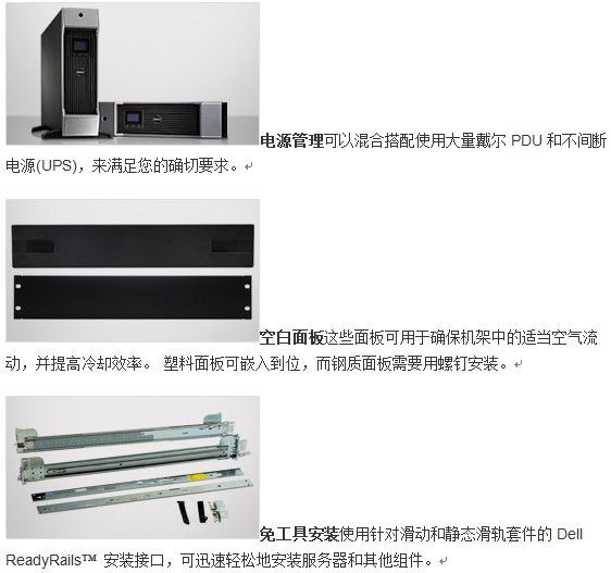 4220机架的设计可使空气更通畅地流动。 前门和后门有80 %的穿孔,再加上灵活的气坝,有助于阻止热空气从后向前流动,从而缓解了许多机架中常见的问题。 戴尔的加宽型机架式盘柜采用了横跨于前端的加大型气坝,以确保适当地限制空气流动。 附带的空白面板可针对机架中未使用的U空间,进一步控制空气流动。 为了实现热通道/冷通道高效散热的数据中心拓扑,标准型机架式盘柜占地面积为两块标准地砖,宽2英尺,深4英尺。 4220W机架稍宽,而4220D机架稍深。 空间规划员可以选择最适合其数据中心需求的外形。面向高效企业的基础架构为了提高数据中心效率,戴尔提供一系列附件来帮助您进一步提高电源管理、增强空气流动并简化组件安装。 其他选项包括机架式风扇、设备架和1U KMM(键盘/显示器/鼠标)控制台。