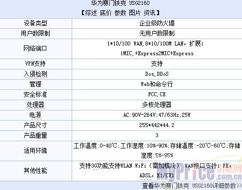 华为赛门铁克USG2160防火墙是一款多功能的防火墙,集成了主流安全功能,具备防DDoS、入侵保护(IPS)、反垃圾邮件、P2P软件阻断和限流等功能,缺点价格有点偏高,性价比方面不占优势。总之有很丰富的接口,而且接口密度大,可以满足你很方便灵活的组网,支持WIFI、3G,能够支持无线网络。有需要的朋友不妨了解下!
