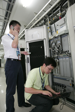技术专家在会展中心机房检测网络设备 “双配合”保障“零问题” 自第一届高交会开展以来,深圳移动公司就积极承担通信保障服务工作,网络部门都要制定一套设备稳定性应急和流量应急方案,以保证会馆现场的正常通话。而正是这种“现场有人感受、后方有人支援”的“双配合式”网络保障工作,保证了历届高交会的手机正常通话。 “高交会期间,由于现场的人流非常大,因此周围的通话网络呈短期高密状态。根据我们的统计,每届高交会,特别是会展中心建成后的两届高交会,会展中心展馆内的话务密度已远远超过了悉尼奥运会,这无疑给移动通信的网络建设和优化带来了极大的挑战。”深圳移动网络部负责人告诉记者。据悉,今年高交会期间,会展中心一带的网络容量可支持40万人同时用手机通话,这不仅在国内,在国外都是领先的。“面对每年新增的与会人潮,我们的通信保障也在随之从容、稳健升级。”该负责人表示。