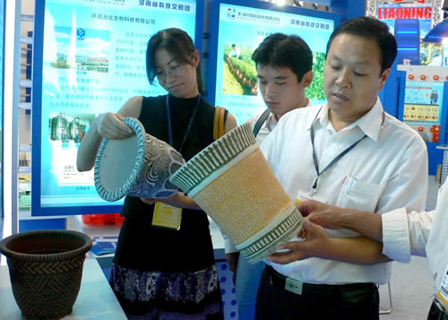 「石塑木浮雕花瓶」在深圳第八届高交会上展出,这种花瓶以废塑料、淀粉等物质合成,一般六至八年即可自动降解,不会造成环境污染