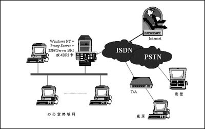 20世纪80年代,是电脑刚登上网络舞台的黄金时段,公司内部局域网如雨后春笋成为人们使用的热点,办公室的电脑管理员一跃成为了网络管理员。到了20世纪的90年代,随着ISDN普及率的日渐提高,办公室内部的LAN也逐步开始采用分布型的通讯模式,利用费用不高的ISDN服务器使企业下属不同子公司的电脑管理员可以通过各自的LAN相互间进行互连(如图1),这些服务器的应用是网络通信的一种可行的途径,而ISDN路由器则是另一种方法。