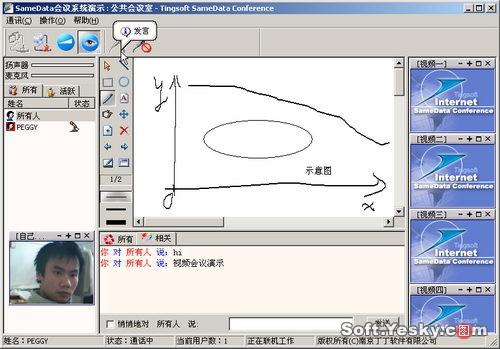 可以看到该系统提供了多路视频展示与共享文档显示区、文本交流、文档共享、语音交流等多种交互手段,各用户可以在主席的协调下使用各项功能轻松地实现实时交流与网络协作。