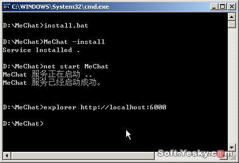 说明:MeChat目录中还有一个Run、bat,该文件用于测试MeChat服务器。如果安装MeChat时Run、bat的命令窗口还开着,则务必先关闭此窗口再执行install、bat。另外,双击执行该目录下的uninstall、bat批处理文件可以停止并删除系统中的MeChat服务。