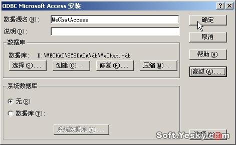 .为使Mechat系统具有较高的运行效率,我们将其添加数据库支持,单击“开始”/“设置”/“控制面板”,选择“管理工具”/“数据源(ODBC)”,切换至“系统DSN”,单击“添加”按钮启动ODBC数据源添加向导,选择“MicrosoftAccessDriver(*、mdb)”,然后在DSN属性设置窗口设置数据源名称为“MeChatAccess”,选择数据库文件为D:\MeChat\SysData\db目录下的MeChat、mdb(如图23)。设置完毕,单击“确定”退出。