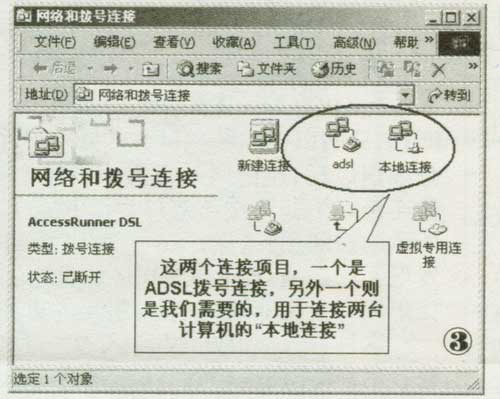 a.接入Internet计算机的网络配置 在Internet接入计算机上,按照上面所述的方法打开“网络和拨号连”对话框。由于这台计算机同时也有ADSL连接,所在该对话框中,现在应该有两个连接项目,一个是用于ADSL连接的,另一个是用于后者——“本地连接”。但若我们打开“网络和拨号连接’对话框时,发现里面存在两个本地本地连接的,也就是用于两个计算机的连接(图3)。
