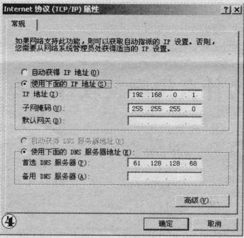 图3 我们须要指定IP地址的是后者--“本地连接”。但若我们打开“网络和拨号连接”对话框时,里面存在两个本地连接——“本地连接1”与“本地连接2”,我们则须要判断哪个是真正的本地连接,而哪个是用于ADSL线路的连接。有十很简单的判别方式,那就是在汁算机屏幕右下角托盘区断开ADSL拨号连接,这时它所对应的那个连接就会呈现灰色,而剩下的依旧呈现绿色的连接项目就是真正的本地连接了。鼠标右击”本地连接”,在弹出的快捷菜单中选择“属性”,打开“本地连接属性”对话框。在该对话框中,选择“Internet协议(TCP/IP)”,然后点击“属性”按钮,弹出“Internet协议(TCP/ IP)属性”对话框。在该对话框中,我们先勾迭“使用下面的IP地址”,然后在“IP地址”栏中,输入“192.168.0.1”,在“子网掩码”栏中输入"255.255.255.0"。然后再勾选“使用下面的DNS服务器地址”,并在“首选DNS服务器”栏中输入你的ISP的DNS服务器地址(如果你不清楚,可以致电当地电信局询问),如图4。