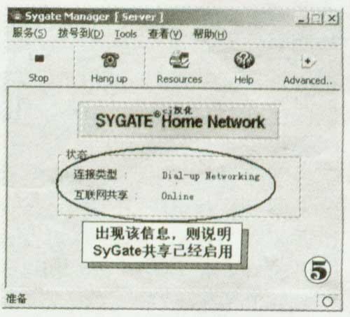 下一步要做的,就是在接入Internet计算机上安装一个代理服务器软件,或者是网关软件,来实现Internet的连接共享。代理服务器软件能够实现的功能要多一些,但是配置起来比较麻烦;网关软件功能相对代理服务器软件功能弱一些,但是对于小型网络共享已经是绰绰有余,最重要的是——它配置简单!在此我们推荐使用网关软件SyGate。相信大家对它不会陌生,我们在共享56K MODEM上网时就会用到它。它的新版本不仅能够良好地支持ADSL等宽带接入方式的共享,而且依旧保持了小巧轻便、配置简单的风格,所以特别适用于家庭、网吧或中小型办公室。 SyGate能够支持所有的Windows版本,软件的下载地www.onlinedown.net/sygate.htm。下载并安装该软件,它会自动检测硬件以及网络配置,惟一需要注意的是:当系统询问你是否要采用并配置DHCP(自动获取IP地址)服务时,一定要选“否”,因为我们已经给两台计算机配置了固定IP地址。安装完成后重启计算机,SyGate会自动加载。现在,Internet接人计算机便成为一台网关计算机了,当它连接上Internet时,另外一台计算机便可以通过它来上网。Internet接入计算机进行ADSL虚拟拨号连接上网后, SyGate会侦测到Internet连接已建立并自动开始共享该连接(图5)。