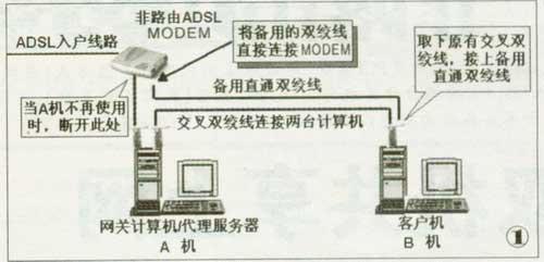 如图1所示,我们在两机之间再布置一条备用的直通双绞线(注意一定是直通双绞线,即两头都是T568B接头)。这样,在A机需要关闭时,A机用户可以将原本连接ADSL MODEM的双绞线取下来,插上这根备用直通双绞线。然后通知 B机用户,B机用户也把交叉双绞线线取下,插上这根直通双绞线。这,时,就相当于ADSL MODEM直接连接在B机上了。