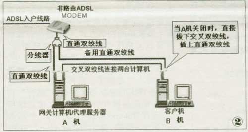 在ADSL MODEM出口处,加上一个分线器。该分线器原理类似电话的分线器,即1口分两口,并联。这种分线器可以在电脑城中销售网络产品的公司处买到。加上分线器以后,拉出两条直通双绞线,一条接入A机,另外一条走线到B用户处,但不做连接。然后,再按照双机共享方式,即图2所示方式进行组网连接,最后得到如图2所示的组网图。这样,当A机关闭时,A用户根本不用通知B用户。B用户连接网络时,发现无法连通,Ping A机IP地址也无法Ping通,即可确定A机已关闭。然后B机用户拔下原有交叉双绞线,插上备用的直通线直接连接ADSL MODEM即可。