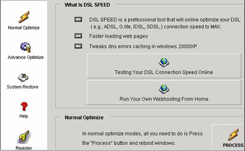 下面再切换到“Advance Optimize”标签页面中,并单击其中的“Start”按钮,这样DSL Speed工具就会开始检测你的ADSL所在的ISP环境参数,并对这些参数进行动态分析验证,以便找到最理想的MTU数值;等到分析验证操作完毕后,你再单击对应标签页面中的“Process”按钮,这样DSL Speed工具就会自动以最理想的MTU数值来对ADSL进行动态优化,优化完毕后,你也必须将计算机系统重新启动一下。到了这里,动态优化MTU数值的任务就算完成了。