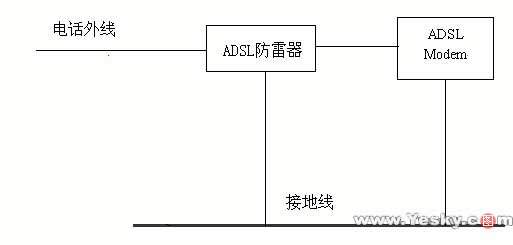 目前最有效的办法就是使用专业的ADSL防雷器(如图4所示),并将防雷器与ADSL Modem设备按照图5所示的画面,同时可靠接地,这样的话强大的雷击电源、电压就会被ADSL防雷器通通过滤掉,而且电话线上的部分噪音也会被排除,如此一来不但能有效保护好ADSL Modem设备的安全,还能保证上网的稳定性。另外,选用具有防雷功能的ADSL Modem设备来预防雷击,也是可行的;只是这种防雷措施几乎是“一次性”的,因为防雷ADSL Modem设备是通过内部的特殊“保险丝”,来预防雷击的,遇有雷击时该“保险丝”会自动断开,日后重新上网时,需要接通“保险丝”才行,显然这种措施比较麻烦。