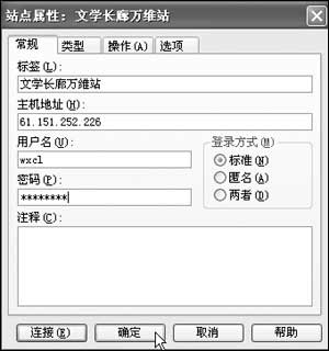 1.标签:即给新建FTP站点起个易记的名称。如“文学长廊”(大家可以根据自己的喜好进行设置),这样我们下次再进入CuteFTP时,直接选取“文学长廊”就可以连接到服务器上。