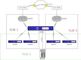 设备和拓扑图都比较简单,关键是要把6008NS进行正确的VLAN划分。我们把6008NS的端口1、2作为连接两个宽带路由器的接口,3-6口为连接4个3616NS的接口。7口为连接服务器的接口。 端口1划分为只属于VLAN1; 端口2划分为只属于VLAN2; 端口3、4划分为属于VLAN3又属于VLAN1; 端口5、6、7划分为属于VLAN3又属于VLAN2。