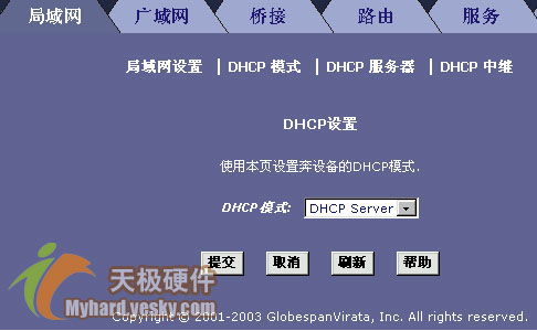 接着,你正确输入登录ADSL设备的帐号名称和访问密码,并单击一下“确定”按钮,就能进入到ADSL设备的参数设置窗口了;单击该设置窗口中的“局域网”标签,然后在如图2所示的标签设置页面中,单击“DHCP模式”处的下拉按钮,并从其后出现的下拉菜单中选择“DHCP Server”选项,最后单击一下“提交”按钮,这样ADSL设备内置的DHCP功能就被正式启动了。当然,要使该功能生效,还需要在ADSL设备的参数设置窗口中,进入到“管理”标签页面中,选中“保存”选项将前面设置的参数保存起来,并重新启动一下ADSL设备才可以。