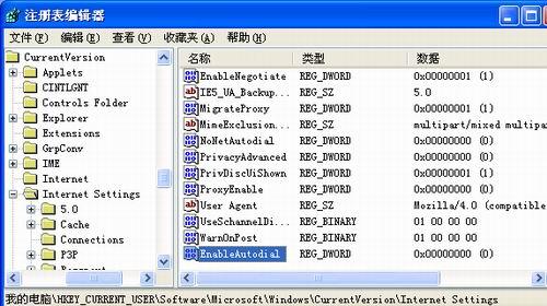 在图4所示的右侧区域中,双击“EnableAutodial”选项(要是没有找到该选项的话,可以依次单击菜单栏中的“编辑”/“新建”/“Dword值”),然后在弹出的数值设置窗口中,输入数值“01 00 00 00”,并单击“确定”按钮,最后重新启动一下服务器系统就可以了。倘若日后你希望服务器不自动拨号时,你不妨打开“EnableAutodial”的数值设置界面,并在其中输入数值“00 00 00 00”,最后再次启动一下服务器系统就可以了。