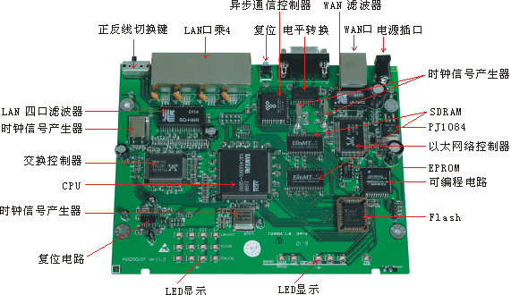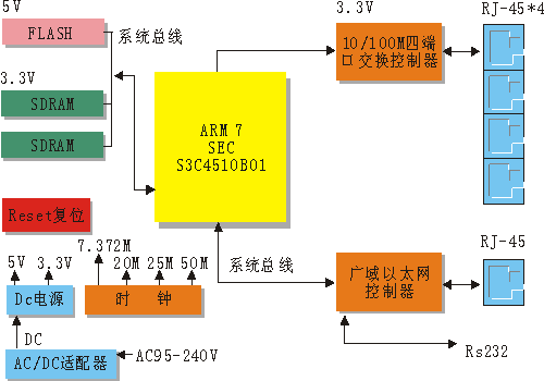 从电路框图看,外置的AC/DC电源适配器将市电变换成直流,再经过DC稳压滤波给整个电路提供5V和3.3V DC稳定工作电源。时钟电路为CPU、RAM和各种控制芯片提供7.372M、20M、25M、50M的工作时钟信号。EA-2204核心是一颗ARM7处理器,通过系统总线连接FLASH和SDRAM,路由器上电后,CPU从FLASH中读取程序和配置数据进行初始化,SDRAM为程序运行和数据处理提供临时存储空间。CPU复位电路在系统上电或电源异常又恢复时使CPU自动复位,用户在必要时可通过按后面板上的复位开关来使CPU复位。CPU控制广域以太网控制芯片,通过一个RJ-45接口或RS232接口,连接国际互联网来处理数据。一个4端口交换控制器,通过四个RJ-45连接局域网集线器、交换机或连接电脑,直接进行数据交换或通过CPU控制与广域网连接进行数据处理。
