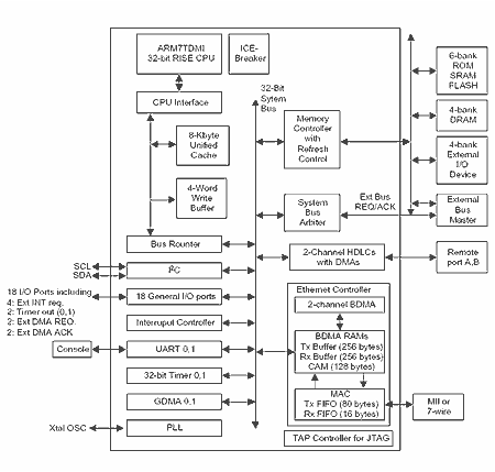 S3C4510B中内置了ARM公司设计的16/32位ARM7TDMI处理器,其内部框图如下: