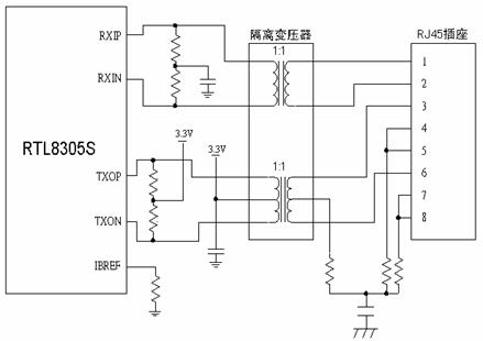 下图为RTL8305S连接局域网的示意图,图中所示为一个LAN端口,EA-2204共4个LAN端口。左边为RTL8305S,中间为隔离变压器,右边为RJ45插座,通过双绞线连接到局域网。