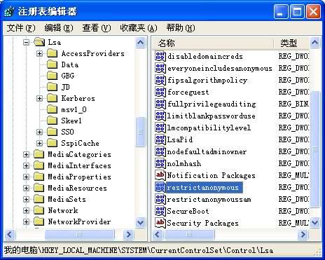 将鼠标定位于其中的HKEY_LOCAL_MACHINESYSTEMCurrentControlSetControlLSA注册表分支,在对应“LSA”分支的右侧子窗口区域中,双击其中的“RestrictAnonymous”键值(如图3所示),在其后出现的数值设置框中,输入数字“1”,并单击一下“确定”,然后再将服务器系统重启一下就可以阻止未授权用户通过空连接方法来访问共享目录了。