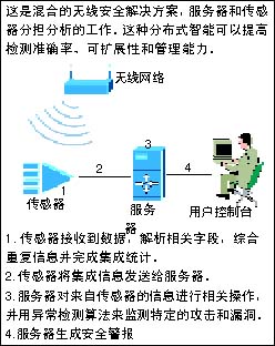 而与之相对应的是以传感器为中心的解决方案。以传感器为中心时,大部分的分析工作都是在传感器上进行的。由于这种方式只需将少的多的数据传送回服务器,网络带宽的使用效率将会提高而整个系统的可扩展性也会增强。但是,这种方案需要传感器拥有较强的处理能力和更多的内存,当系统需要很多传感器的时候,系统的成本就会变得很高。当传感器的覆盖区域重叠的时候,相邻的传感器会将不必要的重复信息传送给服务器。另外,这种方式不能检测某些特定形式的攻击,比如MAC地址欺骗,这种攻击只能通过多传感器相关分析才能监测出来。