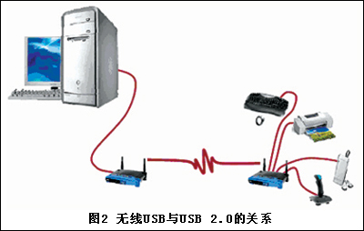 按照USB 1.0规范,现有USB 2.0界面可通过两个Wire Adapter(WA,有线适配器)将有线的USB转换成无线USB。一个WA通过USB 2.0接口接入计算机端,另一个通过USB 2.0接口连接打印机等外部设备,两个WA间通过UWB物理层实现无线连接(参见图2)。