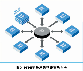 OFDM(正交频分复用)是对信号进行展频调制的一种技术方案。按MBOA规范,UWB的带宽被分成若干个带宽为528MHz的子频段,数据分解后被分配到这些子频段并行发送,接收以后经过重新装配使数据恢复。