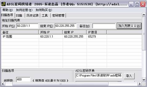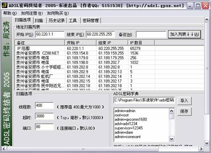 在入侵ADSL猫之前,我们首先要从指定的IP地址段中,找到使用ADSL猫自动拨号上网的宽带用户,这就离不开扫描工具了。ADSL密码终结者2005中已经自带了扫描工具,而且还提供了IP地址段查询功能,可以方便的指定要入侵的IP地址段。