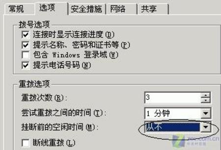 在进行上面的设置时,我们不妨参照下面的步骤来进行:用鼠标右键单击桌面上的“网上邻居”图标,从弹出的右键菜单中单击“属性”命令,打开网络连接列表窗口;在该窗口中再右键单击一下ADSL宽带拨号图标,从弹出的快捷菜单中单击“属性”命令,打开ADSL拨号参数设置对话框;单击该对话框中的“选项”标签,进入到如图1所示的标签页面,如果将其中的“挂断前的空闲时间”参数修改为“从不”的话,就能阻止ADSL宽带调制解调器进行自动断网,这种参数设置适合包月上网方式;如果将其中的“挂断前的空闲时间”参数修改为某一特定数值的话,那么ADSL宽带调制解调器在某一段时间检测不到网络连接存在的话,就会自动将网络连接断开,这样可以有效地节省上网连接费用,该参数设置方式适合按时计费上网方法。