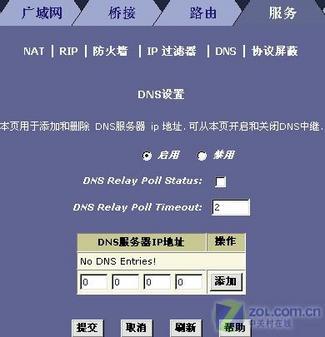 小提示:如果我们使用了ADSL宽带调制解调器的路由共享功能的话,必须事先在宽带调制解调器中,将其DNS服务配置成本地的DNS服务器IP地址,这样可以提高共享上网的速度。在为ADSL宽带调制解调器设置DNS参数时,可以先打开IE浏览器窗口,并在其地址栏中输入宽带调制解调器默认的IP地址(一般为192.168.1.1),单击回车键后,打开管理登录窗口,此时我们可以从ADSL宽带调制解调器的说明书中查找到默认的用户名和密码,正确输入它们后,就能进入到ADSL宽带调制解调器的后台管理配置界面。单击后台界面中的“服务”标签,并在对应的标签页面中再单击“DNS”选项,就能打开如图3所示的设置页面;在该页面中先将“启用”选项选中,然后将本地ISP提供的DNS服务器IP地址正确输入,再依次单击“添加”按钮和“提交”按钮,就能完成DNS参数的设置任务了,之后不要忘记执行保存操作,不然前面设置的参数是不会起作用的。