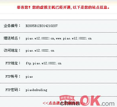 1、注册一个虚拟主机 我们先在虚拟主机服务商处注册一个FTP帐号名为piao,FTP密码为piaohubuding的虚拟主机用户(一般虚拟主机服务商都提供其虚拟主机产品的试用,可以利用这段时间测试一下服务器的安全性),注册完毕后获得一个二级域名piao.w12.***.com(如图1),使用FTP软件将网页上传到虚拟主机,然后输入获得的二级域名就可以访问我们的网站了。
