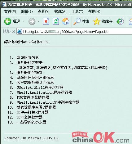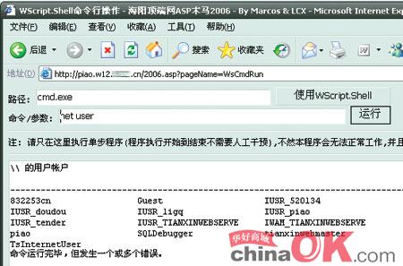 2、上传ASP木马 将一个asp木马上传到测试虚拟主机,这里以海阳顶瑞网的ASP木马2006版为例,上传完毕后在浏览器中输入http://piao.w12.***.com/2006.asp,出现ASP木马的登陆界面(海阳顶瑞网ASP木马已经被各大杀毒软件查杀,可以正常运行,表示服务器没有安装任何杀毒软件,可见服务器管理员的安全意识不高)。我们输入ASP木马默认的登陆密码“lcxMarcos”,登陆成功。如果管理员没有对虚拟主机用户作限制,就可以在ASP木马中查看系统信息、服务。如果没有对FSO、Shell.Application等组件进行设置,则可以浏览服务器硬盘上的所有文件,甚至在“命令提示符”中执行任意命令(如图2)。