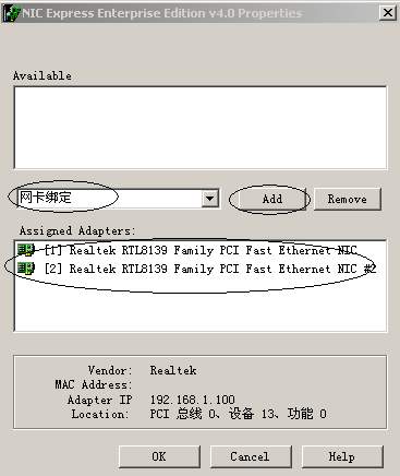 弹出“绑定”窗口后(见图),在中间文本框中输入绑定后的连接名称(如“网卡绑定”),点击“Add”按钮将两块网卡加入到下面的“Assigned Adpaters”即可。接着进入NIC Express的配置界面,保持默认值就可完成安装。