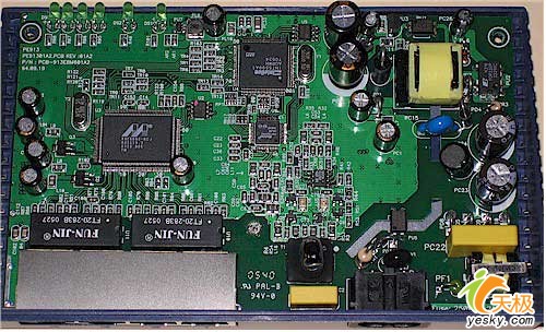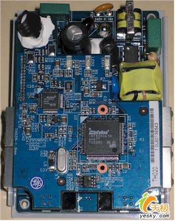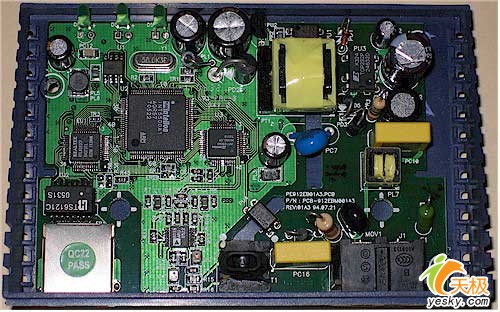 最后,我们就来看看SMC的那款SMCCHT-ETH,乍看之处,你可能会错误地把图9中的那块SMC产品的电路板当成Actiontec公司的那款“HUB”型号产品(图6中所示),它们都使用了那种一体成型的塑料外壳,而唯一不同的是外形尺寸的大小。仔细看一下你可能会发现它的电路板设计实质上与Actiontec公司的那款单端口的产品是一样的,它们之间的不同之处是SMC的这款产品只不过是做成了桌面产品的方式,而Actiontec的HT100是可以直接插在墙壁的电源插座或某个电源插线板上。