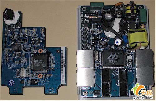 NETGEAR公司的XE104这款产品的内部细节显示的图7和图8中,从图上可看出,这两块电路板与前面所示的电气设计实质上一样的(笔者猜想这可能是采用了Intellon公司对该芯片提出的公版设计模式)。但采用的是把两块电路板叠放在一起的设计方式,要把它们放到那个设计相当简洁的外壳中来可能也是要费是一番功夫的。