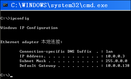 这些用户首先拨通自己家的ADSL,然后用ipconfig命令查看自己的Ip,如下图所示: