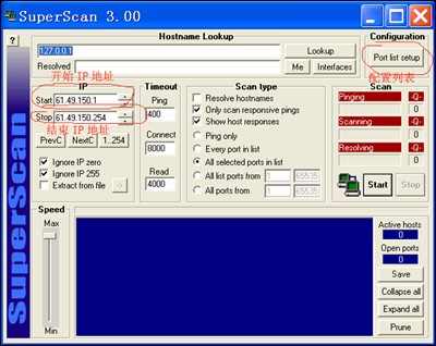 一般北京的ADSL上网的用户多为61.49.*.*。获得了自己的IP段之后,就可以找一个好的端口扫描工具了。新在端口扫描工具有很多,其中支持多线程、体积小、速度快的首推superscan。我们这里就使用它作为示范工具。Superscan的界面如下: